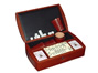 Caja madera forrada en simil cuero, costura en contorno, aplicacion en cuero vacuno genuino. Broche tipo iman. Incluye juego de naipes ingles, juego de domino y dados pocker.